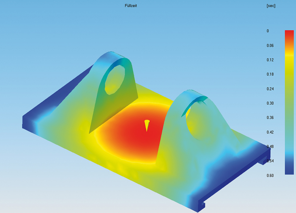 Mould-flow-Analysen Mit dieser 3D-Simulation können wir die Herstellbarkeit eines Kunststoffspritzgussteils und dessen eventuelles Optimierungspotential erkennen. |