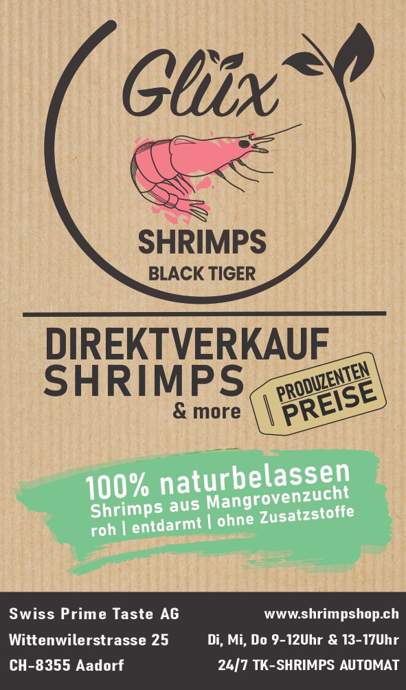 Neu ist auch der Online-Shop. Die Shrimps werden zudem ohne Styropor in exklusiven und nachhaltigen Strohboxen nach Hause geliefert – 24 h Delivery tiefgekühlt durch Trockeneis-Beutel in Strohboxen. Wer auch noch ein passendes Getränk wie etwa Ottenberger Wein oder Bio-Prosecco zur vorzüglichen Delikatesse wünscht, liegt bei Swiss Prime Taste AG bestimmt nicht falsch. Öffnungszeiten: Di./ Mi. und Do. von 9 bis 12 und 13 bis 17 Uhr. Kontakte unter www.shrimpshop.ch oder 052 / 368 00 58
