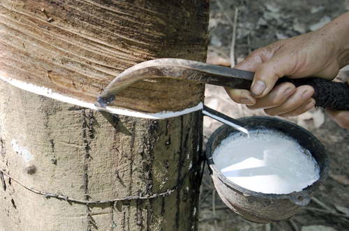 Den natürlichen Anfang nimmt das Gummi nämlich in der Milch des Kautschukbaums. Aus der aufgeritzten Rinde gewonnen und getrocknet, entsteht eine klebrige, eben gummöse Masse.